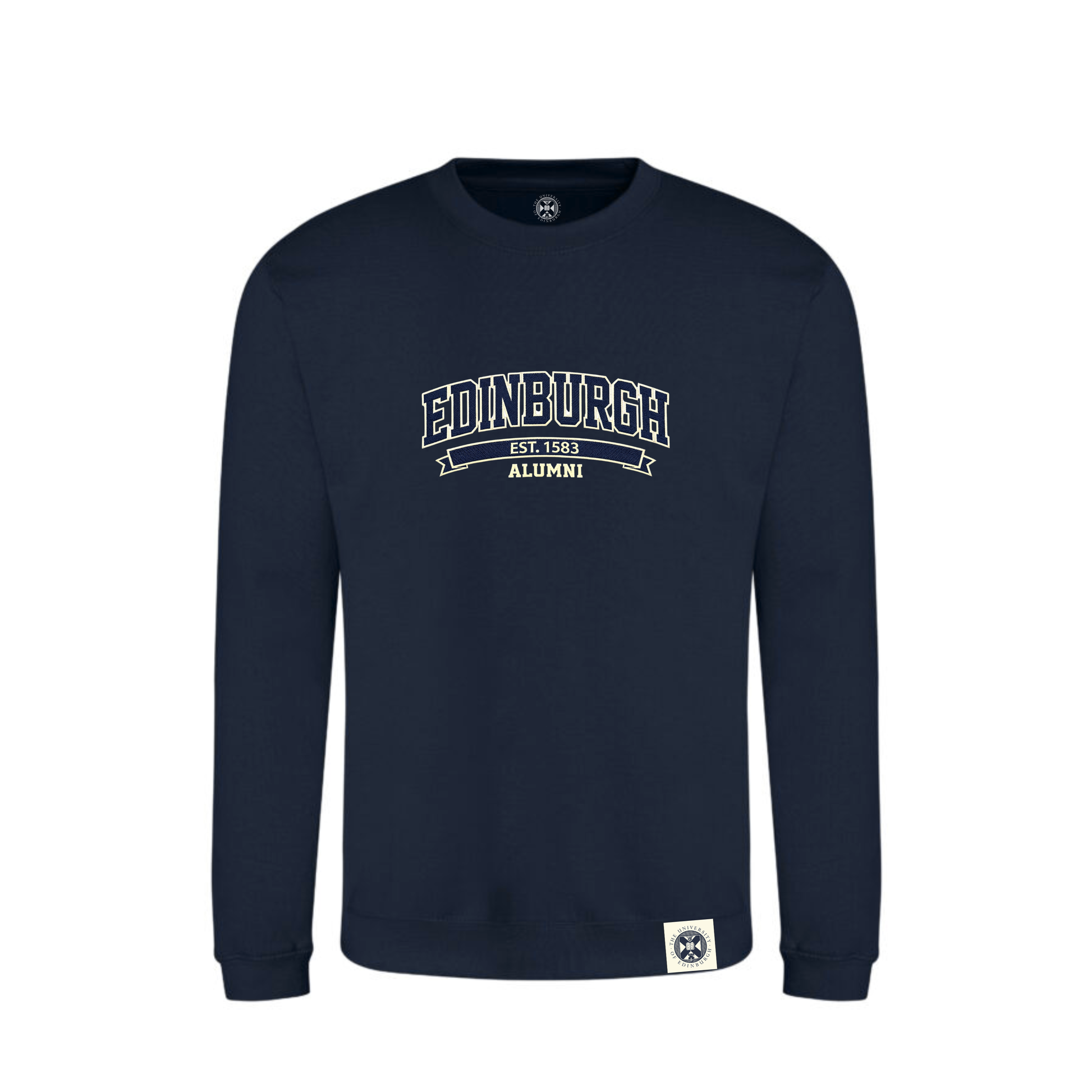 A navy crew neck sweatshirt with a unique embroidered alumni design and the University crest on the hem.