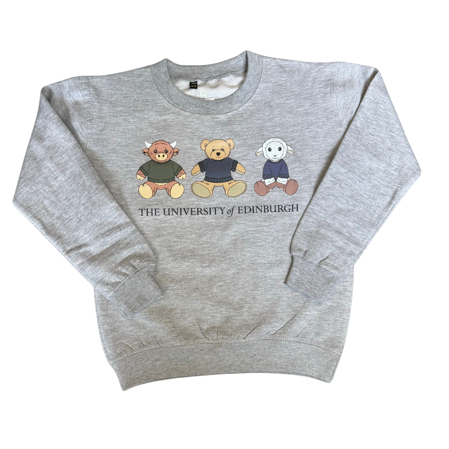 A heather grey sweatshirt featuring Edinbear and his friends Dolly the Sheep and McCoowan the Highland Cow. Illustrations by Sara Julia Campbell, an Edinburgh College of Art alum.