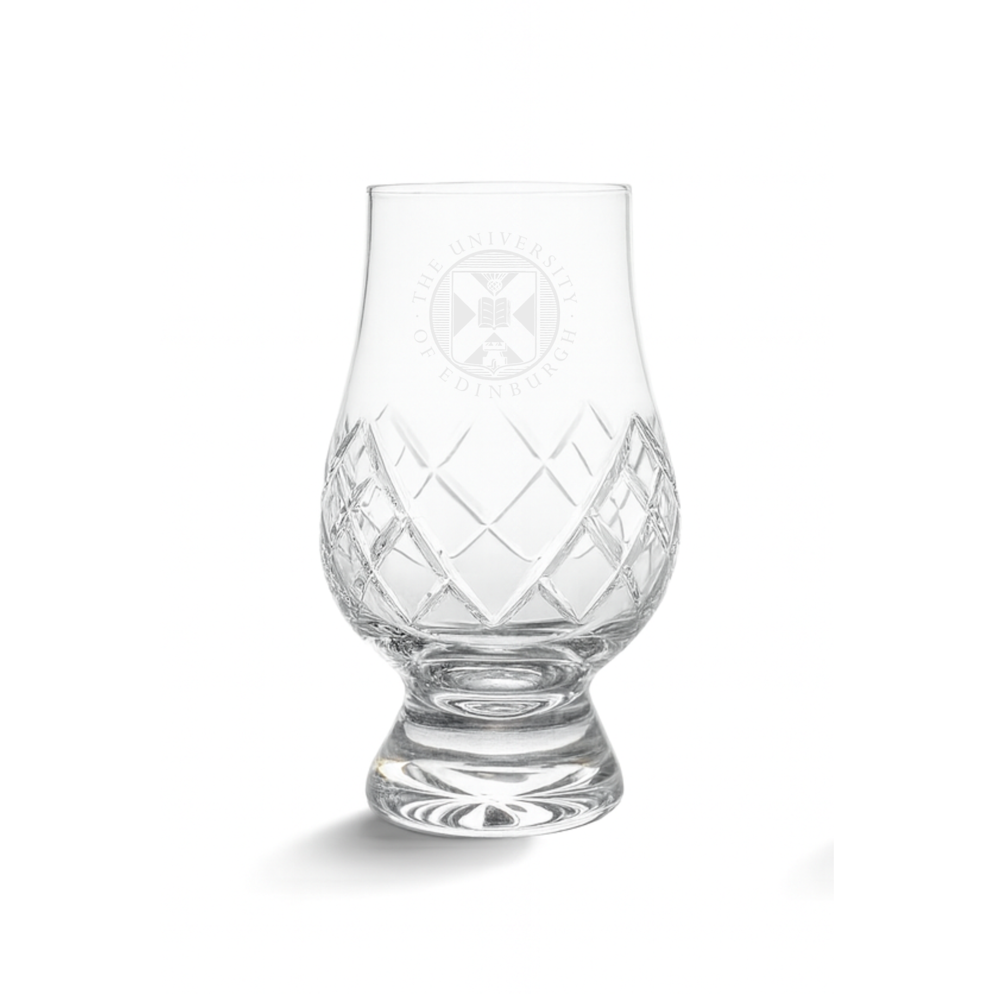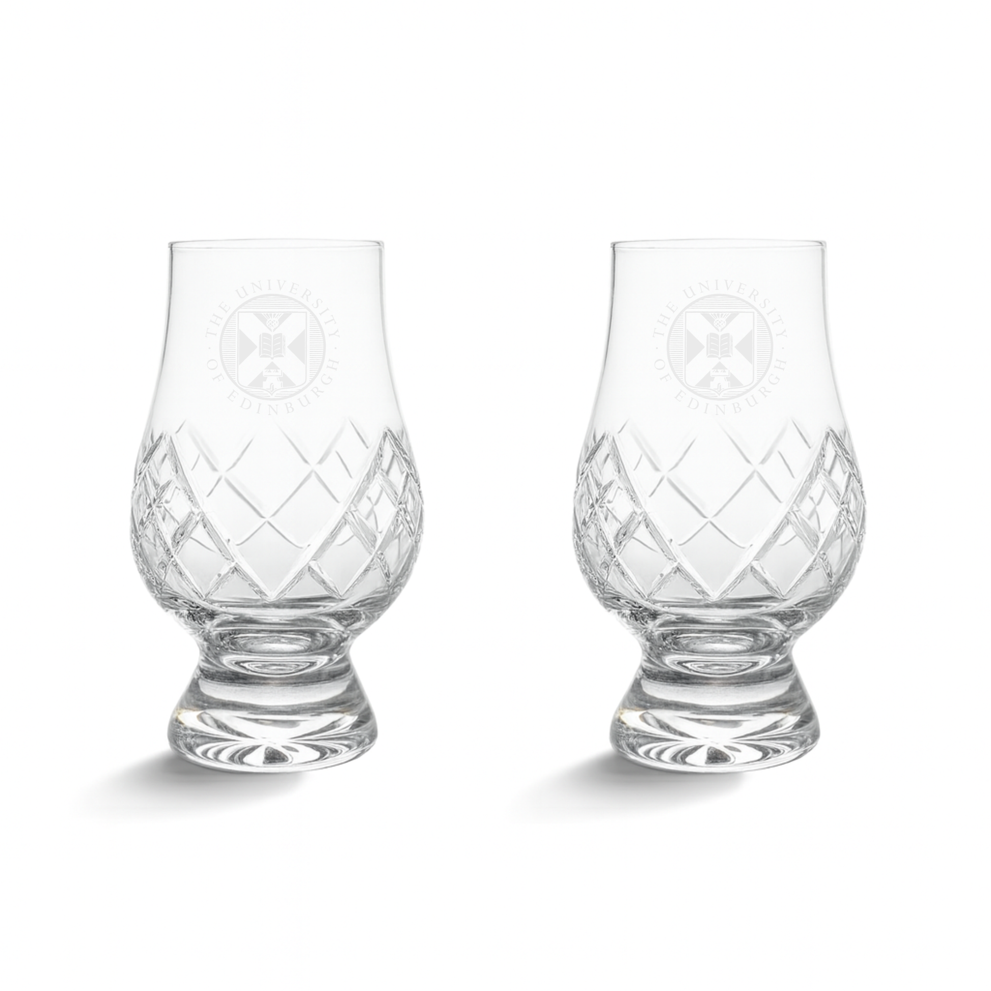 A set of two handmade and hand-cut crystal whisky glasses in a beautiful presentation case, with the University crest engraved