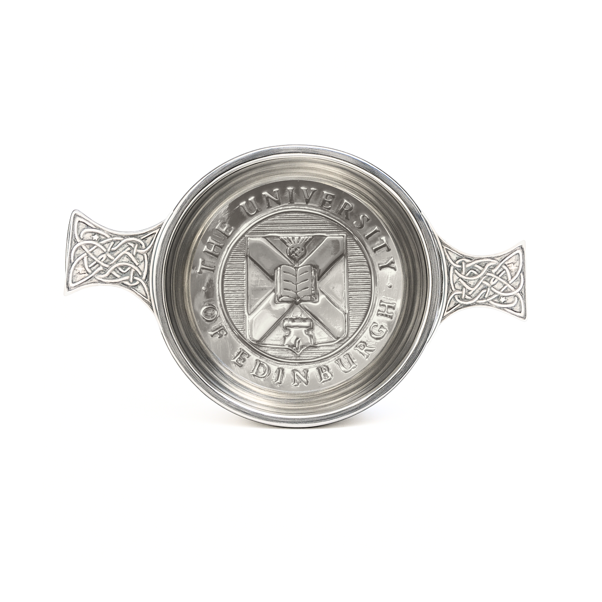 3 inch quaich featuring the University crest etched into the base and a Celtic pattern on the handles.