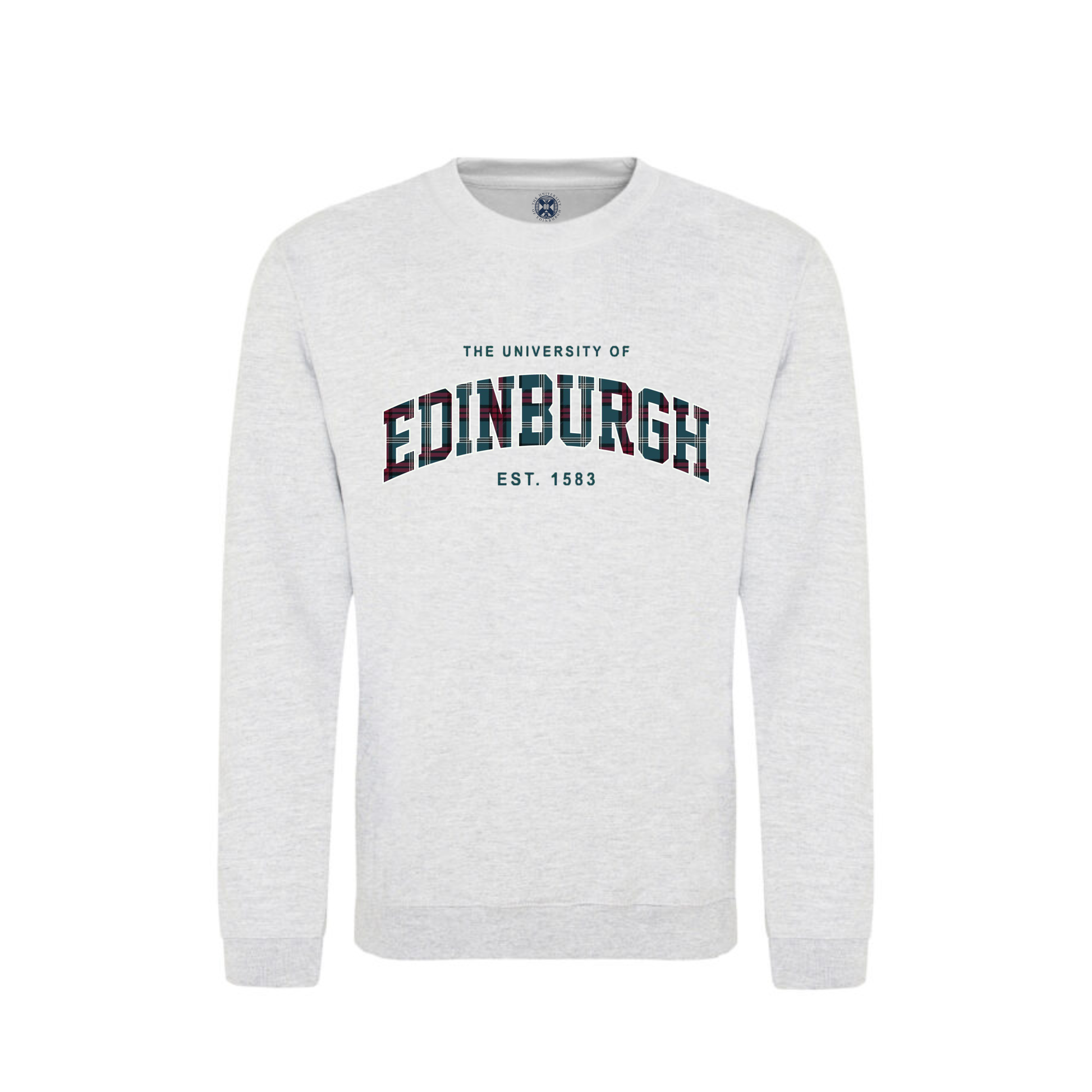 An ash grey crew neck sweatshirt featuring the University of Edinburgh's official tartan in print.