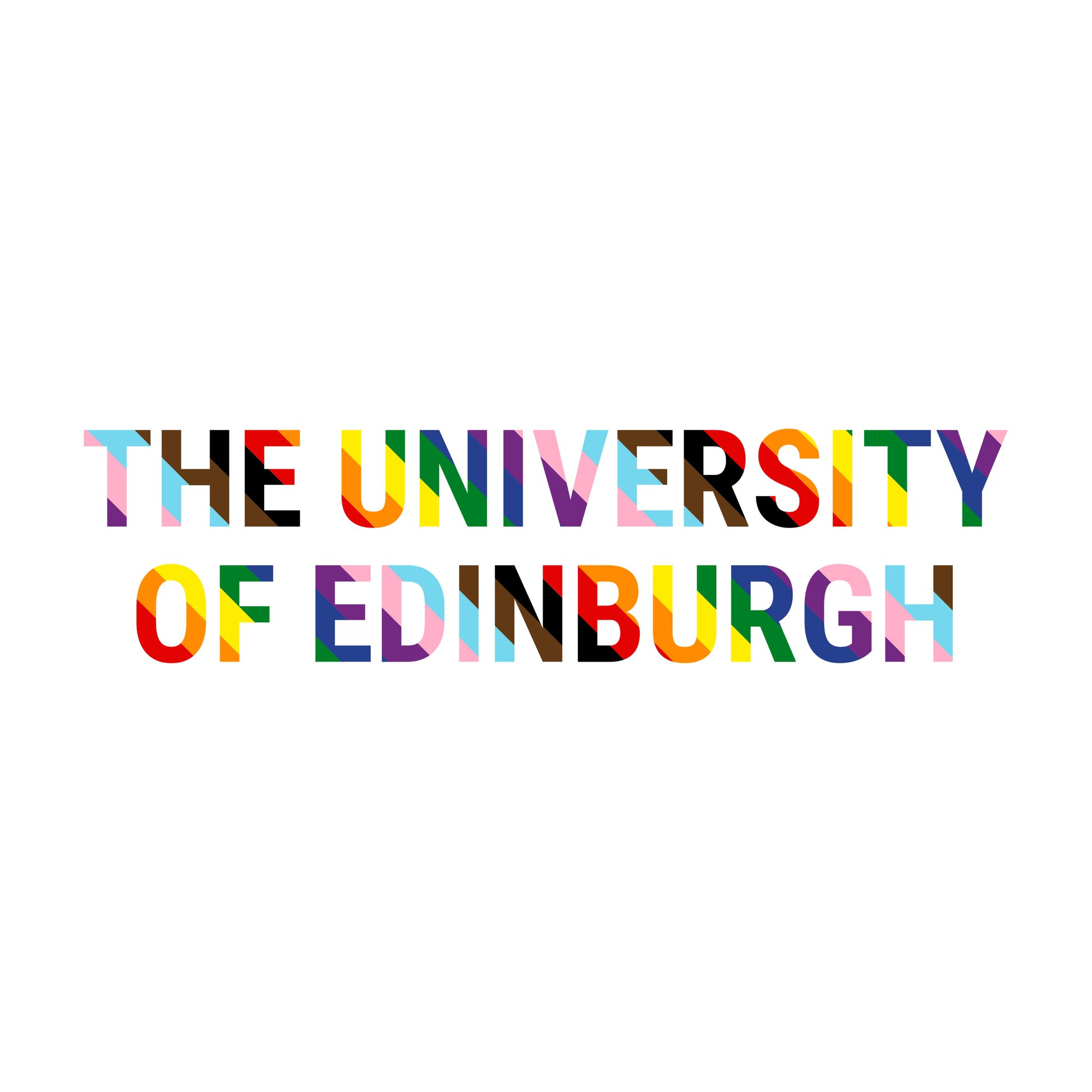 A white mug with a gloss finish, featuring the University name in the colours of the Progress Pride flag.