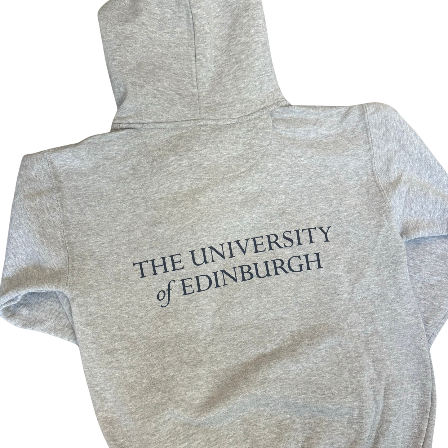 A grey zipped hoodie with full colour embroidery of the University logo and tapered sleeves. Part of our Essentials range.